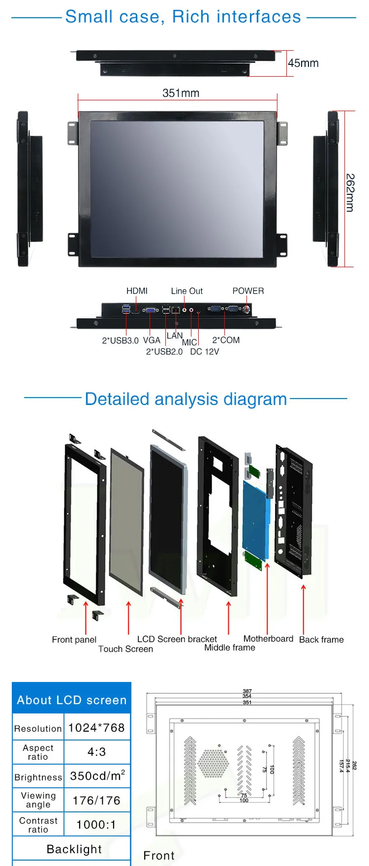 2) 1*VGA, 1*HD, 1*RJ45LAN, 2*USB3.0, 2*USB2.0,2*COM