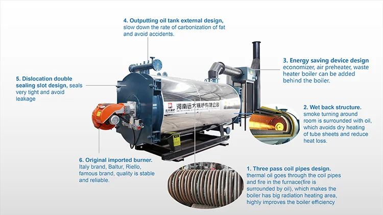1).Three pass coil pipes design, thermal oil goes through the coil pipes and fire in the furnace(fire is surrounded by oil), which makes the boiler has big radiation heating area, highly improves the boiler efficiency and preventing deformation of boiler shell in high temperature heating.