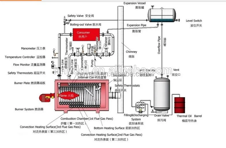YY (Q) W series thermal oil boiler is a kind of boiler which uses gas(oil) as fuel ,thermic oil as medium, hot oil circulation pump to make the medium to forced circulation, deliver the heat to heating need equipments and then go back to the heating furnace.It can obtain a high operating temperature at low pressure and