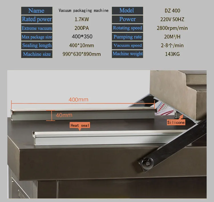 | Machine: | 990*630*890 mm; | Sealing length: | 400*10 mm; |